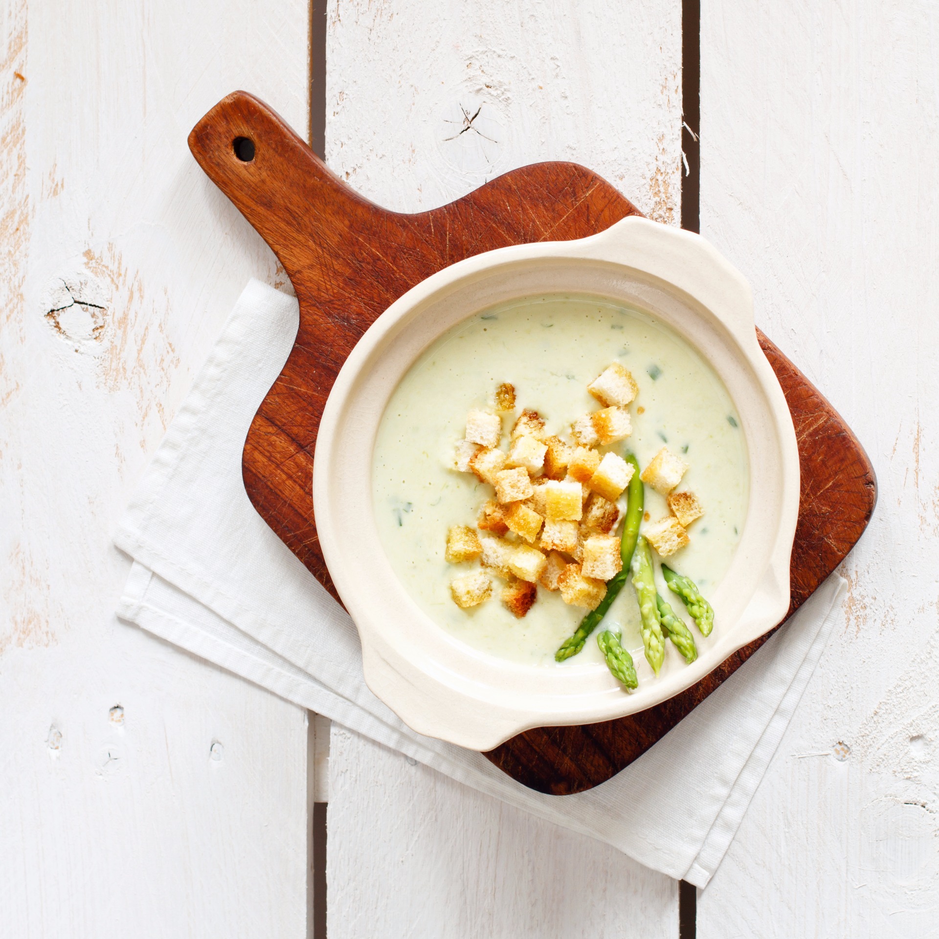 這道美味的奶油濃湯製作簡單,最適合作為春夏季的輕鬆晚餐料理。只需要一些基本食材與新鮮蘆筍即可。確保食材都來自於本地以支持當地農業發展。用酥脆麵包丁、新鮮香草與鮮奶油點綴,您就可以開始享受美味饗宴。
